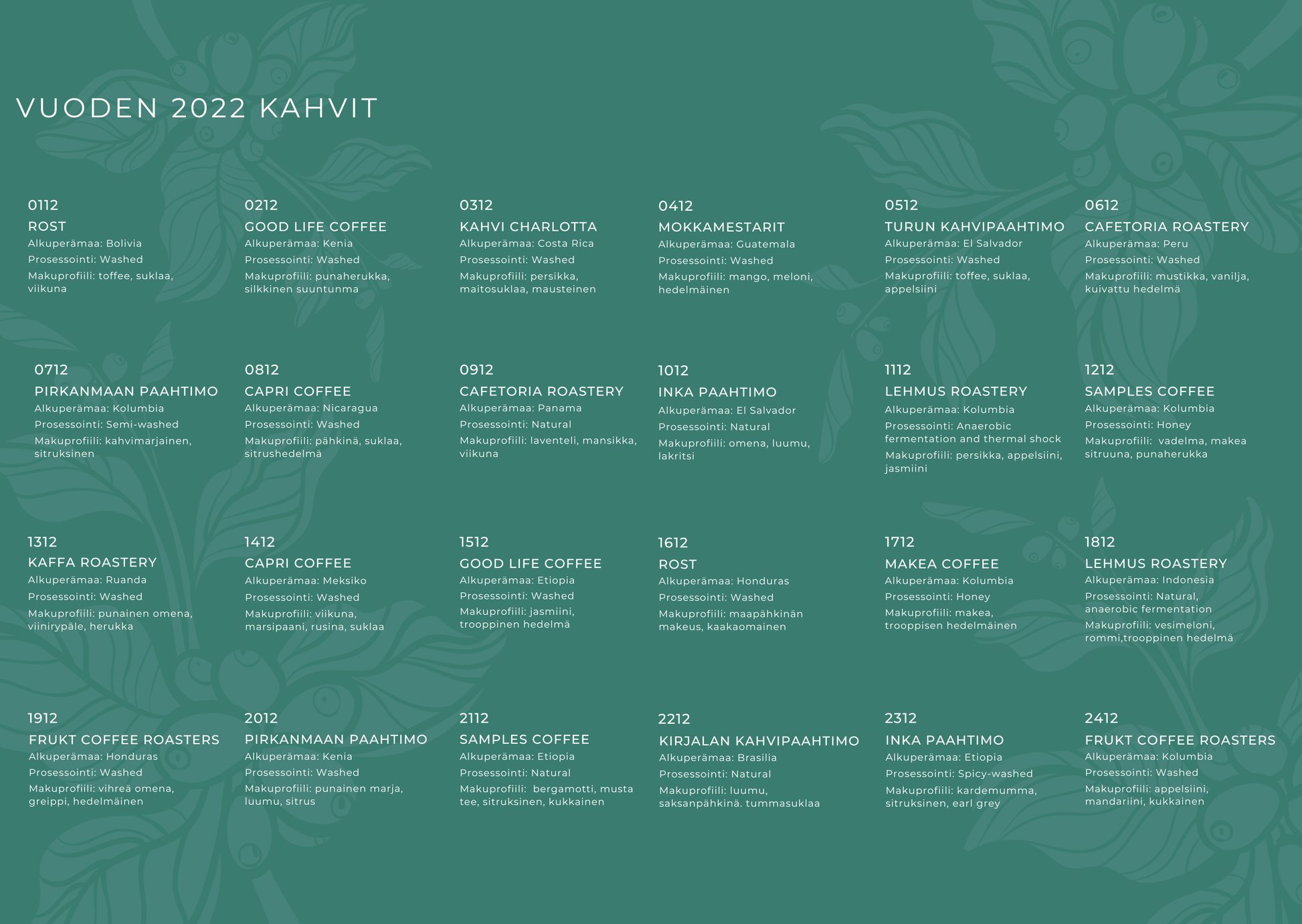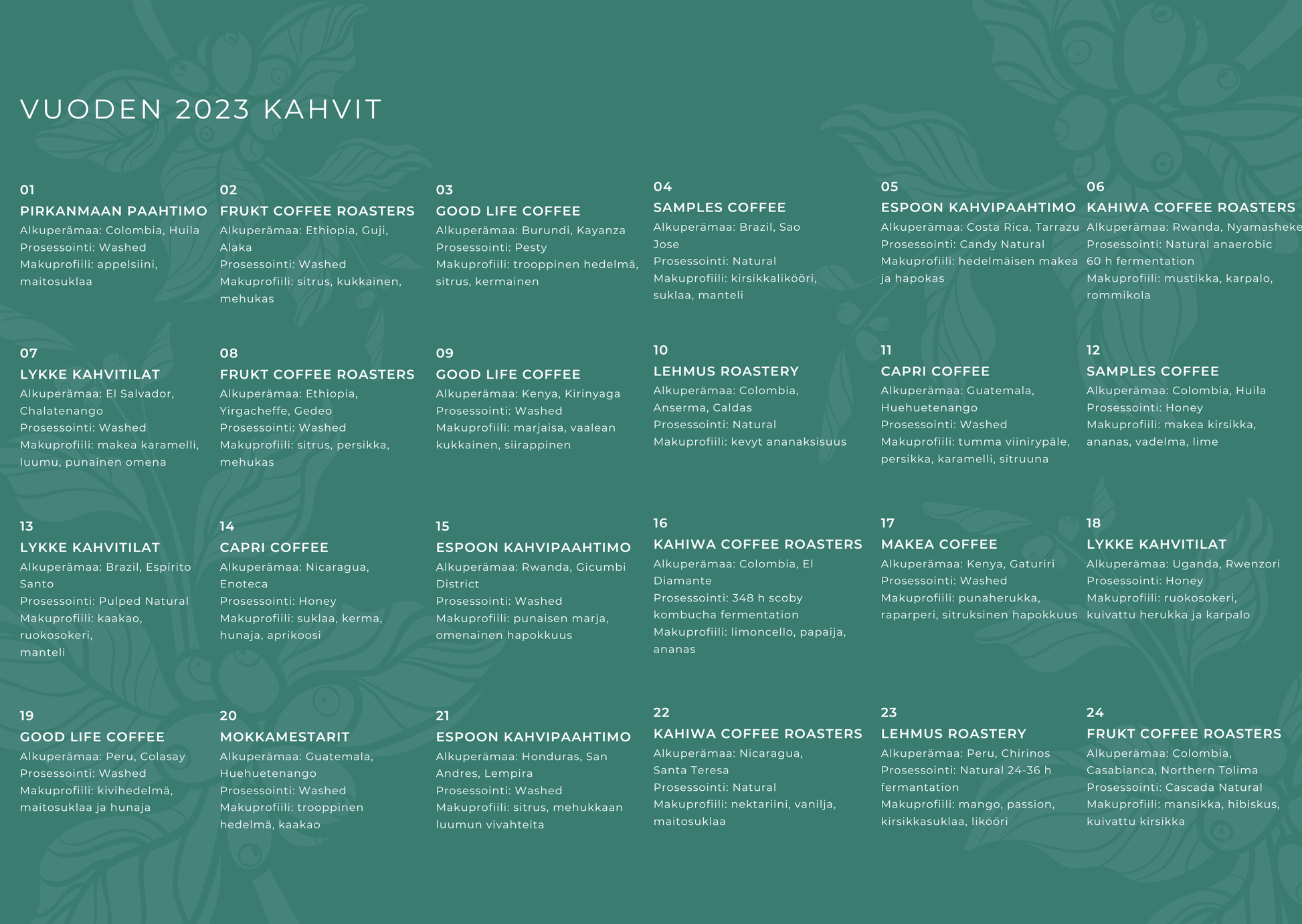 Tarkemmat kahvien tiedot päivittyvät lokakuun aikana, mutta taso yltää vähintäänkin yhtä korkealle kuin aikaisempinakin vuosina (katso kuvista)! Kalenteria myydään lokakuun ajan ennakkotilauksena ja se toimitetaan marraskuun aikana.